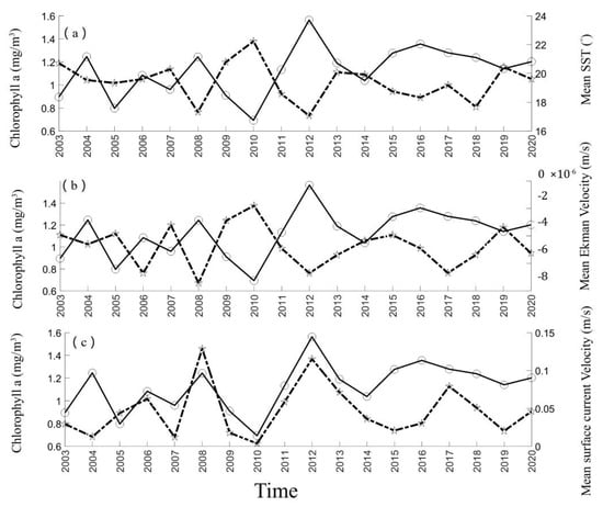 (a) The time series of the mean Chl a (mg/m3) and the mean SST, (b) the mean Ekman Pumpling velocity (m/s), (c) the mean surface current velocity (m/s) in the coastal waters less than 60 m in depth in February during 2003 and 2020. The solid line represents the mean Chl a; The dash line represents the mean SST, the mean Ekman Pumpling velocity (m/s), the mean surface current velocity (m/s) respectively (in (a–c)).