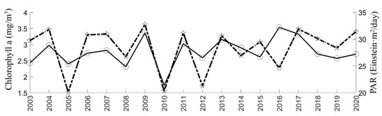 The time series of Chl a (mg/m3) and mean PAR (Einstein·m2/day) in the coastal waters less than 10 m in depth in February during 2003 and 2020. The solid line represents the mean Chl a; The dash line represents the mean PAR in the coastal waters in February during 2003 and 2020.