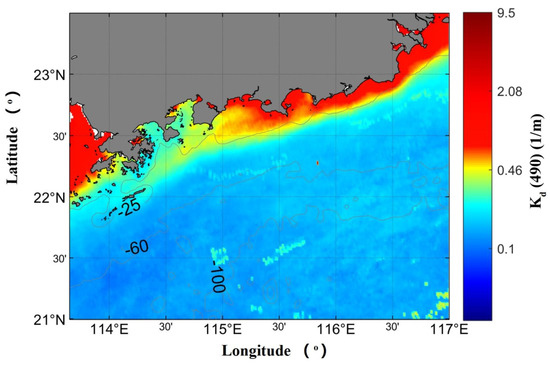 where Rrs is remote sensing reflectance with a unit of sr−1. Kdclear (490) denotes the model for open clear water, and Kdturbid (490) denotes the model for coastal turbid water).