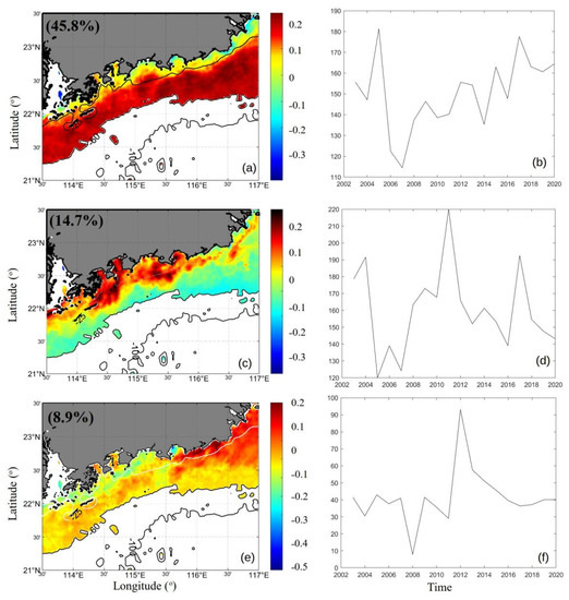 EOF of Chl a in January during 2003 and 2020; (a,c,e) are the first (EOF1), second (EOF2), third (EOF3) EOF mode, respectively; (b,d,f) are the time-varying amplitude coefficients for EOF1, EOF2, and EOF3 respectively.