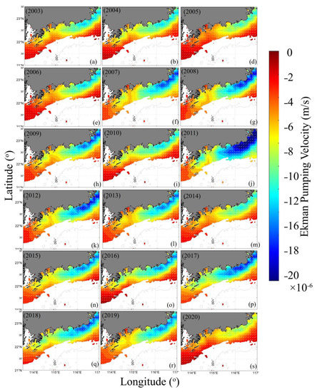 The mean Ekman pumping velocity (m/s) in winter during 2003 and 2020. (a–s) represents 2003 to 2020.