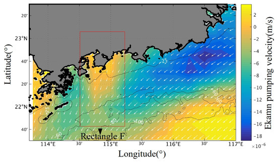 The overall purpose of this study is to figure out the temporal and spatial of Chl a in EGD during the during the downwelling favorable wind period. Based on the long term satellite observations, a relatively higher Chl a zone was detected from the southeastern coast of Guangdong Province to Dangan Island in winter. The higher Chl a zone had been found to be related to the downwelling intensity and the flows with the low temperature and high nutrients from ZFC. The coastal higher Chl a zone is a very important energetic oceanographic feature, usually occurred in the regions where the density, velocity, salinity or temperature gradient is extremely high or a significant discontinuity exist. It could play an important role in the dynamical and chemical processes. In order to improve our understanding of the distribution pattern of the high Chl a zone near Dangan Island and the coast of Shanwei in winter, a high spatial resolution satellite imagery and a daily product are applied. There two feature like pattern (Rectangle C and Rectangle D) in Chl a can be observed (Figure 5) which were also showed in EOF2 with a higher spatial coefficients (black spots) (Figure 14c). The significant cross-shelf penetrating fronts near the coast of Shanwei (Rectangle C) was also clear in SST (Rectangle E in Figure 16). The significant cross-shelf jet can be detected by the lower temperature fronts extended eastward from Honghai Bay, Guangdong to the continental shelf in deeper water. In order to analyze the effects of the coastal currents on the distribution of Chl a in Rectangle C, the surface current speed and direction at station S2 were provided in Figure 17. GF-1 images were acquired at 03:15 am (Coordinated Universal Time, UTC) 8 January 2020. Figure 17 showed the direction of the current toward the east or northeast during that time. The high Chl a near the coast of Shanwei was advected to the continental shelf with deeper water by the cross-shelf jet. A relatively higher temperature can be detected on the seaward side of the Guangdong Coastal Current (GCC) (Figure 16). The South China Sea Warm Current (SCSWC) flows from the northeast of Hainan Island to the coastal area off EGD which had been found in the coastal area east of 116°E in winter [44]. The station S2 located between the GCC and the strong northeastward SCSWC. The cross-shelf jet detected from the Chl a and SST image may be induced by the warm water intrusion. Besides, there was a high Chl a region near the coast of HongKong in rectangle D (Figure 4). The Ekman pumping velocity retrieved from ERA5 at 03:15 am (UTC) 8 January 2020 was given in Figure 18. The downwelling favorable wind is dominant in rectangle E. The high Chl a from the coast of Shenzhen was advected by the southwest flow to the coast of HongKong. In addition, the pile up of water along the shore caused a secondary circulation which in turn transported the coastal nutrient in subsurface and bottom waters to the continental shelf with deeper water. The vertical mixing caused by downwelling jet could provide more nutrients to the euphotic zone and enable phytoplankton to grow. The wind was not uniform at this location. It worth to note that the positive Ekman pumping velocity in Rectangle F shown in Figure 18. Meanwhile, a relatively lower Chl a jet appeared in Rectangle D in Figure 15a. The coastal front extended southwestward from the southeastern coast of Guangdong Province to Dangan Island in the South China Sea were cut off by the lower Chl a jet. The relatively lower Chl a near the coast of Dapeng Bay was advected offshore by the southward flow induced by the wind. The cross-shelf transport resulted in the lower Chl a jet which crossed the high Chl a front in Rectangle F.