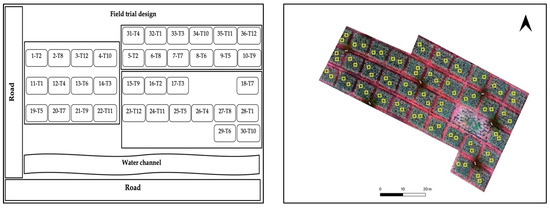 The whole sugarcane field was allocated into twelve (12) fertilizer treatments with three replications, as shown in Figure 2 and Table 3. Altogether thirty-six (36) blocks (7 × 6 m2) were designed for each treatment, and 90 three-budded setts were planted per block. Two sampling sites of subblock (1.5 × 1.5 m2) were selected randomly in each block as average canopy area of each plant is 1.5 m2.