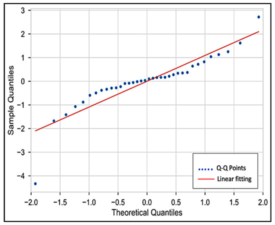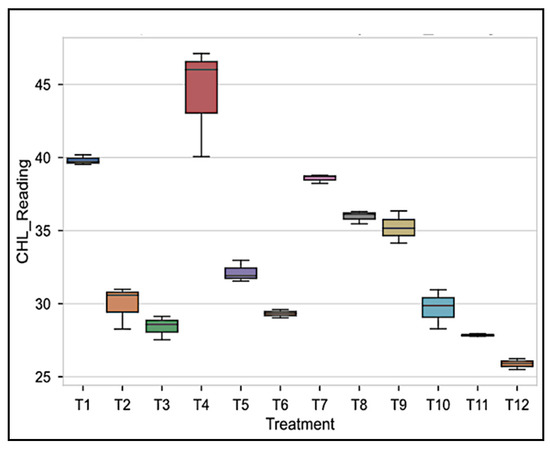 A one-way ANOVA test was performed to estimate the significant relationship between all twelve (12) fertilizer treatments and sugarcane chlorophyll content. The result shows a significant interaction (p = 0.001) between all fertilizer treatment and chlorophyll content. Figure 4 shows the comparing the treatment means and variability of chlorophyll reading, and Figure 5 shows the quantile-quantile (Q-Q) plot confirming that the data were adequately close to the theoretical reference line, representing a soundly model fit.