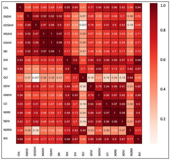 Correlation matrix plot between chlorophyll content and different vegetation indices.