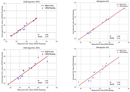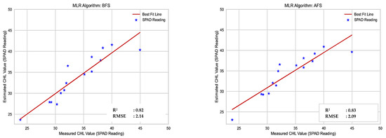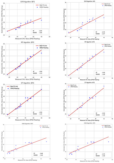 The ML models evaluated; MLR, RF, DT, SVR, XGB, KNN, and ANN are all good at handling a continuous dependent variable that is correlated with VIs. The use of spectral vegetation indices in conjunction with machine learning models proved to be an effective method for predicting chlorophyll content consistent with [64], and spectral indices have proven to be an essential technique for evaluating nitrogen [14]. This study did not remove the soil from the reflectance map to estimate vegetation indices because the crop completely covered the soil during the experimental period. However, it is necessary to remove the soil for estimation of VIs during the early stage of sugarcane crops as an aerial map can be shown the soil between the sugarcane crops. We used 80% of the available VIs as input training data and 20% as validation data to estimate the machine learning model’s performance on new data. Best fit line plots were generated to compare all ML models using both BFS and AFS methods, as illustrated in Figure 7. The line of best fit is a line that runs through a scatter plot of data points and best reflects the relationship between them [65]. The regression ML analysis output can be used to predict the chlorophyll content over variation in VIs. The red line in Figure 8 is referred to as the best fit straight line for each model.