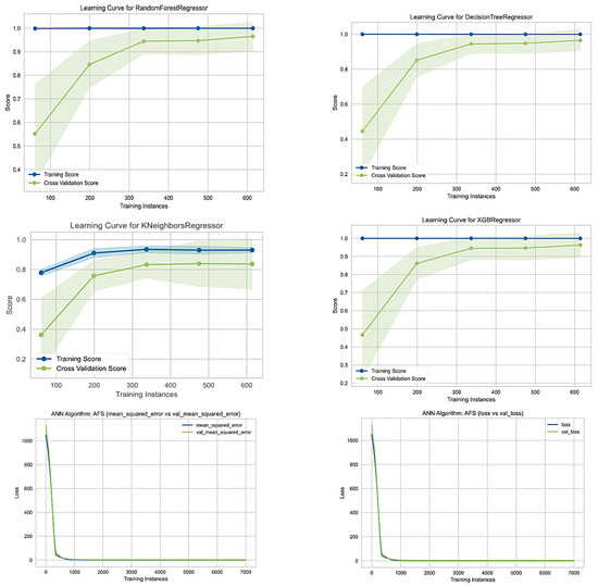 Figure 9 shows the learning curves of MLR, RF, DT, SVR, XGB, KNN and ANN to evaluate the model learning performance over training instances. The shadow green and blue represent the standard deviation of accuracy, while the lines show the mean accuracy values in the proposed models. Learning curves are a common diagnostic tool for algorithms that learn progressively from a training dataset in ML [66]. The model’s performance improves over time, indicating that the model is learning and improving [67].