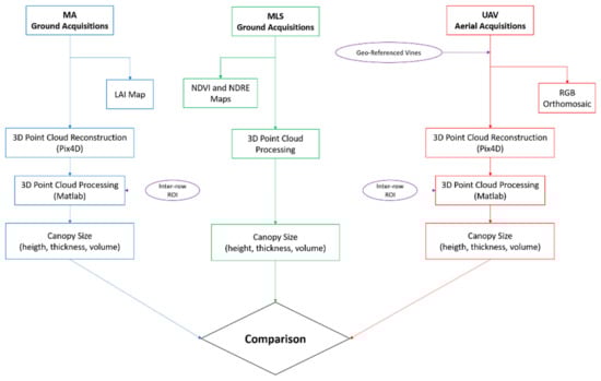 The MA data were first processed to generate a LAI map of the test vineyard and then to reconstruct 3D point clouds of the tested vines. The MLS data were directly processed to create a NDVI (Normalized Difference Vegetation Index) map, a NDRE (Normalized Difference Red Edge) map and a 3D point cloud of the scanned vineyard rows. The UAV data were preliminary processed to generate an RGB orthomosaic of the vineyard and then reconstruct its 3D point cloud using the same MA algorithm and processing workflow.
