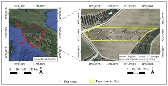 Field tests were carried out in a vineyard in the Chianti Classico area, located in Gretole (43°27′23.0″ N; 11°13′51.9″ E), Castellina in Chianti, Siena, Italy (Figure 2). The experimental site was focused on 2 ha, where 48 test vines were sampled at three different phenological stages (BBCH 55, BBCH 65, BBCH 73) [49]. In each phenological stage, three types of measurements technologies, namely MA, MLS and UAV, were performed in the same day. The vineyard was located on a hillside, had a density of 5000 vines ha−1 and the cultivar was the Vitis vinifera L. cv. ‘Sangiovese’. The vines were 15-years old, trained with a horizontal spur-cordon (4–6 buds per spur), at 0.80 m mean height from the ground with a planting distance of 2.50 × 0.80 m. The vine rows orientation was East-West.