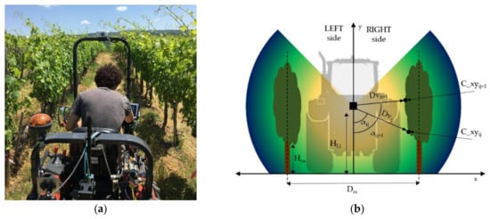 MLS ground data acquisition: (a) Main devices installed on the MLS for the canopy volume and vigour data acquisition. (b) LiDAR and algorithm working geometry. Model orientation and main geometries and measurements considered for the calculation of the volumes i.e., HLi—LiDAR height from ground-level; Hco—cordon height from ground-level; Drs—row-spacing; Dvij—distance between LiDAR and canopy at specified angular position j and at moment i, αij—angle subtended by DVij, C_xyij—pinpointed canopy data in cartesian coordinates.