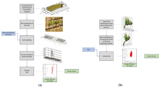 Substantially, the code reads the processed UAV and MA 3D point clouds and gives as results the main canopy size parameters (i.e., thickness, height and volume). The working schemes of the algorithm for the UAV and MA 3D point clouds are reported in Figure 8.
