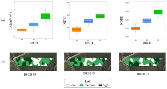 (a) LAI, NDVI and NDRE box-plots for the three phenological stages; (b) LAI zonation maps in three classes of the test vineyard for each phenological stage, where the classes were determined using the 25% quantile for the LOW class and the 75% for the HIGH class, being the MEDIUM class related to the 25–75% quantile interval.