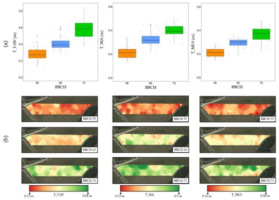 UAV, MA and MLS thickness results: (a) box-plots for the three phenological stages; (b) thickness zonation maps of the test vineyard for each phenological stage, where a single color scale was used starting from the minimum value (red) to reach the maximum value (green).