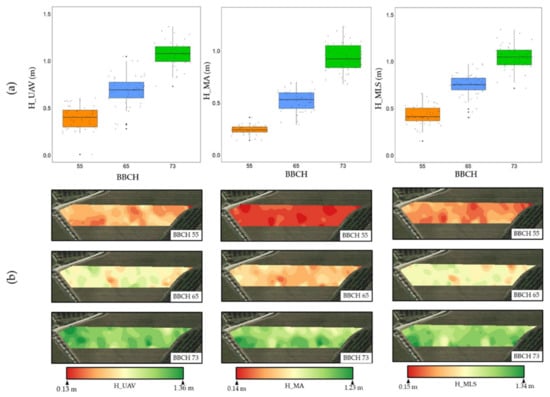 UAV, MA and MLS height results: (a) height box-plots for the three phenological stages; (b) height zonation maps of the test vineyard for each phenological stage, where a single color scale was used starting from the minimum value (red) to reach the maximum value (green).