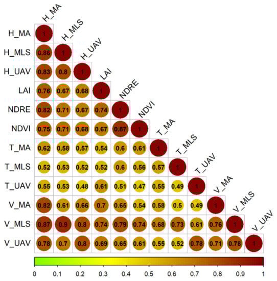 The “corrplot” package was used to visualize the R2 data matrix and the “ggplot2” package was chosen to show the linear correlations and canopy parameters trends with scatters- and box-plots, respectively [55,56].