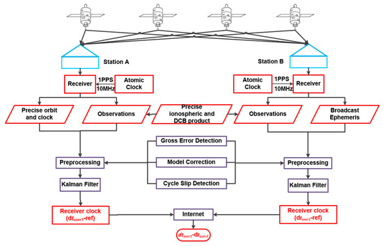 A flowchart of the SF PPP time transfer is exhibited in Figure 1. Station A and B were both connected to the local atomic clocks. The observations and broadcast ephemeris from the receivers and the precise orbit/clock products, ionospheric/DCB products were prepared first. Then, the SF PPP model was used to estimate the receivers’ clock offsets after gross error detection, model correction, cycle slip detection, etc. The receiver clock offsets are calculated as follows for stations A or B: