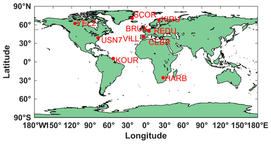 To study the performance of BDS-3 SF PPP time transfer using B1I or B1C signals, 10 stations from MGEX were chosen and tested. In this work, BRUX was set as the central node because an atomic clock was connected. Nine time links were then presented. The observations are from DOY 30 to 60, 2021. Precise orbit/clock products are from GFZ, the ionosphere products were attained from IGS. The locations of the selected stations are exhibited in Figure 2. A summary of all the stations is listed in Table 1, which includes information for receiver, antenna and external atomic clock. In addition, our work will be tested with the development of GAMP software [29].