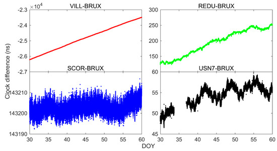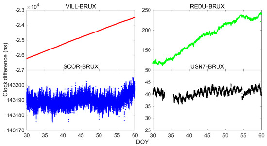 Time transfer usually takes the time difference between two places. Figure 8 and Figure 9 exhibit the time transfer solutions obtained from SF1 and SF2, respectively, for four time links. Note that other time links show similar performance and are not described in detail here. Additionally, part of the time series in the figure is missing due to the loss of observations. Combining two figures, we can draw three initial conclusions. First, for time transfer solutions, the jumps in the receiver clock offsets have completely disappeared, see REDU-BRUX, which further proves that the jumps in the receiver clock offsets were mainly caused by the reference of precise clock products. Secondly, the trend of time transfer with SF2 is similar to that of SF1. Thirdly, the noise of time transfer solutions for USN7 and BRUX with SF2 are larger than that of SF1, which is consistent with the above conclusions.