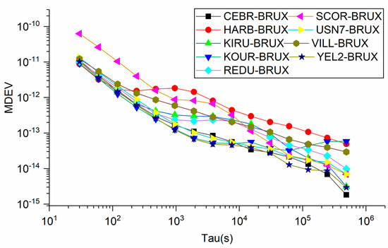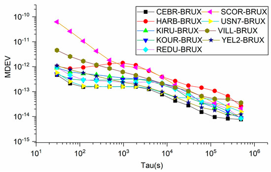 In addition, we further present the MDEV of 9 time links obtained from SF1 and SF2 in Figure 10 and Figure 11, respectively, which can explain the characteristics of the two models in the frequency domain. One finding, which can be observed obviously, is that the short-term frequency stability of SF1 outperforms that of SF2. This can explain our previous finding that the noise of SF2 solutions is larger than that of SF1, while the frequency stability in the long-term exhibits the same performance between the SF1 and SF2 models. More interestingly, we find that the frequency stability of SF2 before 120 s shows a similar performance for all time links, except SCOR-BRUX, while that of SF1 presents a different performance for different stations. This is because the accuracy of ionospheric products is different at different latitudes. Overall, we recommend the SF1 model for time transfer.