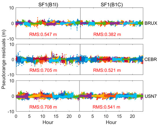 Pseudorange residuals can reflect the performance of PPP from another aspect. Figure 12 exhibits the pseudorange residuals of the SF1 model with B1C and B1I observations for three stations. From the figure, two findings are presented. First, because the reference of precise satellite clock products is an IF ionospheric combination, the DCB correction is required. The pseudorange residuals of SF1 with B1I and B1C did not show significant system differences, indicating the correctness of our method for correcting DCB. Secondly, the RMS of SF1 with B1C is smaller than that of B1I, such as (0.547, 0.382) m for the RMS of SF1 with B1I and B1C, respectively, at BRUX station. This can explain the superiority of SF1 with B1C observations.