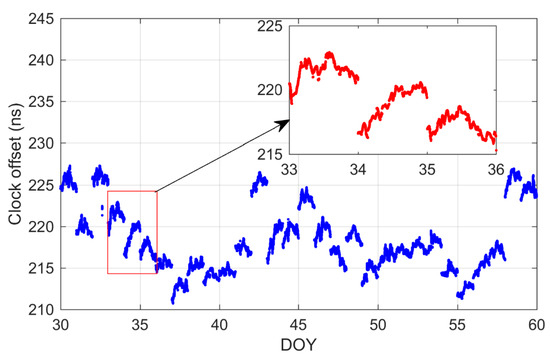 Since Ge et al. [25] have selected the optimal model (SF1) among IF, ionospheric-corrected and SF1 SF PPP time transfer models, we studied the performance of SF1 and SF2 time transfer methods. Figure 4 and Figure 5 exhibit the receiver clock offsets calculated with the SF1 model with B1I for BRUX and REDU stations. In addition, the receiver clock offsets obtained from the SF2 model with B1I observations for BRUX and REDU stations are displayed in Figure 6 and Figure 7. By comparing the four figures, four preliminary conclusions were drawn, which will be outlined later. First, obvious jumps in the daily time series in both SF1 and SF2 methods were found, especially at BRUX station. Usually, the time series of an atomic clock in the timing lab is generally stable, such as that of BRUX station, which is connected to UTC (ROB). Hence, the jumps in the receiver clock offsets are mainly caused by the datum of precise satellite clock products. At present, the datum of precise satellite clock is aligned to the broadcast GPS time for GPS-only at GBM products, while the references for other satellite system clocks, such as BDS, GLONASS and Galileo are not imputed to a stable time system. Luckily, the reference time of precise clock products will be eliminated for the SF PPP time transfer, see Equations (6)–(8). The second finding is that the values of the receiver clock offset obtained from SF1 and SF2, respectively, are obviously different. However, the trend of the time series from SF1 and SF2 is basically the same. As we pointed out in Equation (6), the receiver clock offsets calculated from the SF2 model absorbed the receiver clock offsets at first epoch. Note that the time series in Figure 6 and Figure 7 add initial values. However, the initial value is not very accurate because we used the initial value of the first epoch calculated by the SF1 model. Thirdly, compared with Figure 4 and Figure 6 or Figure 5 and Figure 7, we can find that the noise levels of the solutions from SF2 are larger than that of SF1, especially in partial magnification. That means SF2 is not as good as SF1. This conclusion will be further proved later. Fourthly, although the noise of SF2 is larger than that of SF1, the short-term fluctuation of its time series is relatively smaller than that of SF1. This may be affected by the characteristics of the ionospheric products used in SF1.