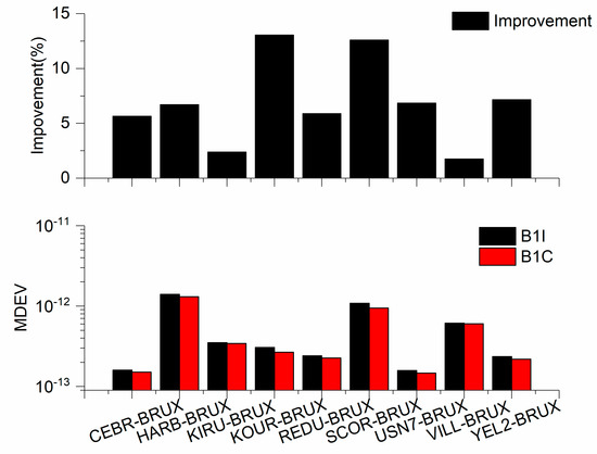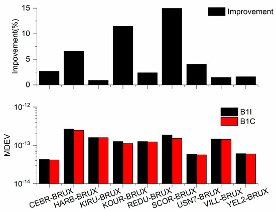 The MDEV of 9 time links from SF1 with B1I and B1C observations of 15,360 s average. The improvement indicates the frequency stability of SF1 with B1I is compared to that of with B1C observations.