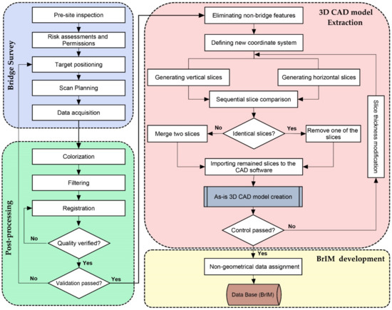 This section elaborates on all the necessary steps for a reliable bridge survey using TLS and the proposed method of extracting a well-detailed 3D CAD model from the registered point clouds as the BrIM core model. In particular, all the requirements of phases from bridge survey, post-processing, 3D CAD model creation to final data connection into the 3D solid model are described. The proposed workflow is presented in Figure 1. This workflow can be useful for bridge surveyors concerning a quantitative TLS survey as well as a well-detailed 3D CAD model extraction and BrIM development from the generated point cloud.