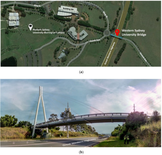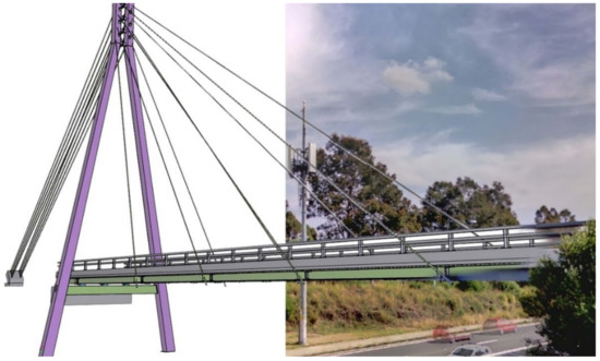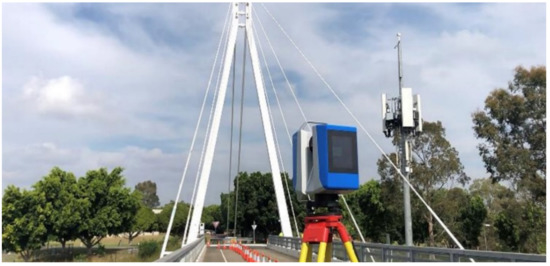 To better understand the application of TLS in 3D CAD model development and investigate the valuable benefits of the proposed methodology and challenges involved, a real field study was carried out to collect the point cloud of a bridge called the Western Sydney University Bridge (commonly known as the Werrington Bridge), over the Great Western Highway, located in Werrington city, New South Wales, Australia, Figure 3. The Werrington bridge is a cable-stayed bridge with an A-frame pylon consisting of two legs, both composed of steel plates butt welded together along their long edges to form lengths of built-up Rectangular Hollow Sections (RHS), which in turn form the pylon’s height above ground. Drawings of the bridge, dated 1990 and 1991, from around the time when the bridge was constructed [61], indicate that the concrete deck is steel reinforced and forms a composite structure with the underlying steel frame via shear studs (shown in the drawings) and BONDEK steel sheeting. Along each side of the composite deck are concrete kerbs topped with steel railings. The composite deck is supported by three lines of four bearings (one line at each concrete abutment, and one line at the pylon’s beam) and a set of eight stay cables, which are in fact round bars, anchored to the upper end of the pylon. The pylon is stabilized against toppling into the bridge’s main span by another set of eight stay cables anchored into a concrete block within the southern end of the bridge.