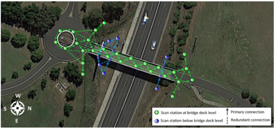 The site survey was carried out after initial investigations considering important factors previously mentioned in Section 2.1 and safety risks involved. To avoid making multiple site visits, the site survey was also confirmed via available photographs, specifically satellite images of bridge and its surrounding using Google Street View photographs taken from the vicinity of the bridge. Finally, the scan plan of Figure 4, which shows 40 stations on and around the Werrington Bridge, was developed to enable the TLS to gather sufficient data without the need to either set foot on the highway below the bridge based on safety requirements, or introduce specialized access equipment. During this procedure, scan stations were placed at regular intervals, where possible, in order to have at least one primary connection with other scan stations with several views/points in common. Moreover, redundant connections, which relate to additional instances of networks, were considered in the suggested scan plan in order to assure scan station connections and facilitate registration procedures. As shown in Figure 4, 28 of the proposed scan stations were at the level of bridge’s deck to approach the roads, and adjacent grassed areas. However, with a view to scanning the underside of the bridge’s deck, 12 scan stations on the scan plan were spread out on the grassed areas below the level of the bridge’s deck.