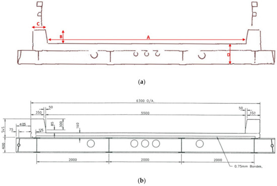 Geometrical parameters for distance measurement: (a) extracted cross-sectional profile of the bridge, (b) As-designed CAD drawing, Unit: mm.