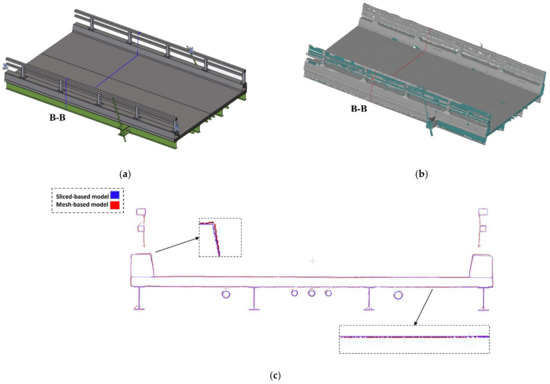 To further validate the reliability of the sliced-based approach, two parts of the Werrington bridge, depicted in Figure 7, were inspected and analyzed by calculating the deviation of the created 3D CAD model from the conventional mesh-based 3D CAD model and the TLS-based point cloud. The comparison results of this analysis are shown in Table 5. Additionally, a cross-sectional profile of the part A was extracted and analyzed from both the sliced-based model and the mesh-based model, as shown in Figure 11.