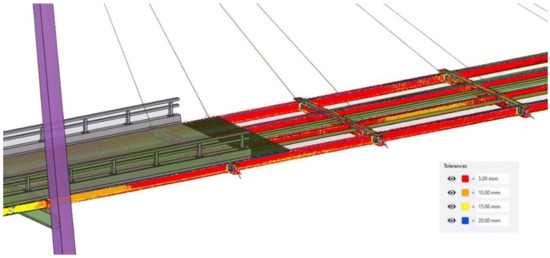 In another effort, considering the group of bridge girders as the reference elements, the deviation of the generated 3D CAD model and the point cloud was evaluated and compared. This evaluation shows the distance less than 5.00 mm between the majority of the girder elements drawn and the point cloud, indicating that the two datasets are in an acceptable agreement. The result of this evaluation is shown in Figure 12. It is worth mentioning that the deviation analysis may also be used as a clash detection process to find areas where elements from the constructed 3D model could not perfectly overlap the acquired point cloud.