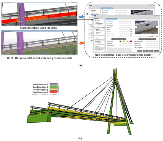 In the case of Werrington bridge BrIM, the designed plugin was used to assign various reports and records to each individual bridge element. In this regard, component-level information such as the element’s details, material, maintenance history, and some interpretations of the element’s condition state were gathered and assigned to create a reliable BrIM. Moreover, TLS data were used for clash detection in order to identify discrepancies between the ideal 3D CAD model and the captured point cloud. Figure 13a depicts the effective detection of clashes and the importation of this information into the BrIM. This information can then be used for damage identification and interpretation of the element-based condition states. As a tangible example, Figure 13b demonstrated the schematic of Werrington bridge BrIM with interpreted condition state of each element.