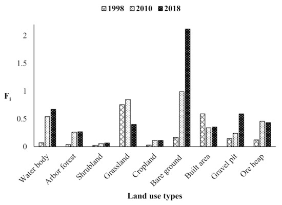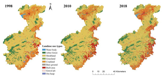 Land use types of the study area in 1998, 2010, and 2018.