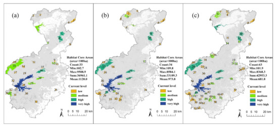 Selected habitat core areas of the study area and their importance level in (a) 1998; (b) 2010; and (c) 2018.