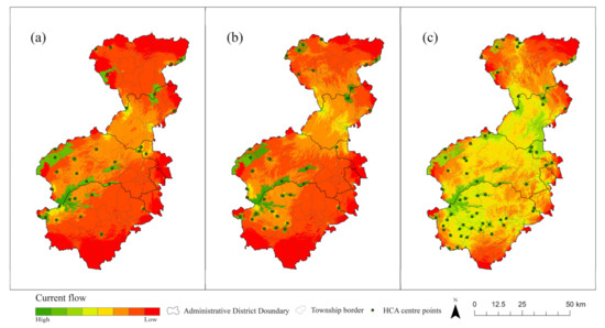 Maps of current flow based on circuit theory: (a) year 1998; (b) year 2010; and (c) year 2018. From top to bottom, the administrative districts are Yanqing, Changping, Haidian, Mentougou, Shijingshan, Fengtai, and Fangshan.