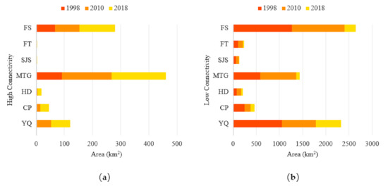Zoning area statistics for high connectivity and low connectivity areas: (a) area of the high current density value region in different zones from 1998–2018; (b) area of the low current density value region in different zones from 1998–2018. In the vertical coordinate, abbreviation FS for Fangshan District; FT for Fangtai District; SJS for Shijingshan District; MTG for Mentougou District; HD for Haidian District; CP for Changping District; and YQ for Yanqing District.