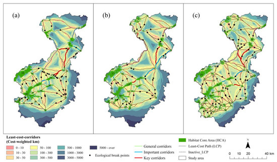 Meanwhile, based on the circuit theory, we used the Linkage Mapper plug-in tools of ArcGIS to extract the path with the least resistance to connect two ecological source sites as ecological corridors [56]. Ecological corridors are bridges between ecological sources and low-resistance ecological channels for ecological flows between neighboring ecological sources. The Linkage Pathways tool is used to map the linkages among “core areas” of habitat on a landscape. First, we calculate the cost-weighted distance (CWD) of all pixels on the integrated ecological resistance surface to the source. The cost-weighted distance (CWD) of all the pixels on the integrated ecological resistance surface to the source is created, and then, the CWD grid is overlaid with the source to calculate the cumulative cost paths between sources. The least-cost distance (LCD) is formed by the minimum value of the path, the corresponding paths are the least-cost path (LCP), and finally, the critical corridors and potential corridors are obtained. Large traffic roads affect landscape fragmentation and cause blockage to ecological corridors; thus, we overlayed the traffic road map with the ecological corridor map for analysis to identify the ecological breakpoint areas.
