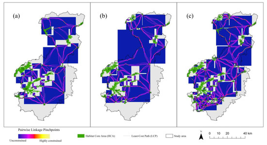 Although the overall connectivity of the study area was greatly improved in 2018 (Figure 8c), the areas of fragile and narrow pinch points became more numerous. The highly restricted pinch points may be due to the expansion of traffic roads and the high-density built-up areas, and the lack of potential low-cost pathways in the vicinity of some link areas. Despite the potential importance of these pinch points for maintaining the connectivity of the ecological network integrity, however, the narrow nature of these connections means that they are fragile and may not persist with future land use changes. For example, the pinch points between HCA 16 and 12 in 1998 (Figure 8a), HCA 15 and 12 in 2010 (Figure 8b), and HCA 28 and 21 in 2018 (Figure 8c) change significantly as the surrounding land use is strongly disturbed by anthropogenic interference, surrounded mainly by the Yongding River, Miaofeng Mountain Park, Laobadi Scenic Area, and so on. Figure 8 shows that there is a large number of pinch points within the Baihua Mountain Nature Reserve, such as between HCA 18 and 22 (Figure 8a), HCA 17 and 20 (Figure 8b), and HCA 29 and 34 (Figure 8c), and a large number of pinch points also exist in the southern part of the study area (Figure 8). The encroachment of urban development may destroy the already weak connectivity and further reduce the “pinch points”; so, the pinch point area should be a priority area to protect the connectivity.