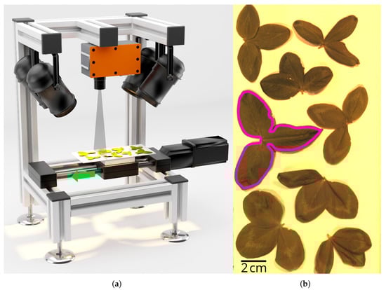 Hyperspectral data acquisition. (a) Illustration of the measurement setup. Here, the slider moves the sample stage with specimens through the camera’s scanning line, illuminated using halogen lamps. (b) RGB image of the representative hyperspectral imaging data. An acquisition with eight samples of clover leaves is shown. Manually processed polygon annotation for one sample is shown in pink.