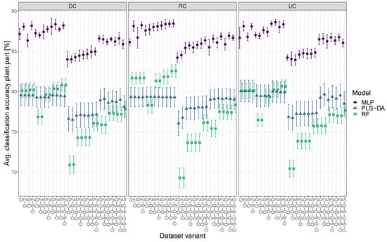The evaluation of the mean plant part classification accuracy across all calibration and preprocessing variants showed that, on average, MLP performed best, followed by PLS-DA and RF, with the best model having a classification accuracy of 86.7%, 78.9%, and 77.8%, respectively (Figure 5). MLP showed the smallest standard deviation followed by RF and PLS-DA. Of the 81 different dataset variants, the best not significantly different models per model type included 60 MLP, 72 PLS-DA, and 28 RF models. Interestingly, for all model types, the O variant was included in these groups. Furthermore, variants differing only in subsequent Z-standardization showed no significant differences. As with the species group result, some individual models for specific dataset variants outperformed model types that performed well on average.