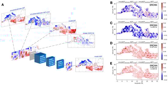 Super-Resolution Convolutional Neural Network (SRCNN) adapted to the reconstruction of absolute dynamic topography from multiple channel inputs. (A) SRCNN network architecture. (B–E) Relative performance of the SRCNN reconstructions, assessed on the independent test data as the difference between the RMSD between the altimeter-like and original model output and the RMSD between the super-resolved absolute dynamic topography (ADT) and the original model ADT (red indicates smaller RMSD from model predictions). The panels show the performance of the models trained/tested considering: (B) the full set of predictor variables; (C) removing ∂SST⁄∂t from the predictors; (D) removing ∆ADT from the predictors; (E) removing both ∂SST⁄∂t and ∆ADT. ADT and related RMSD values are expressed in m.