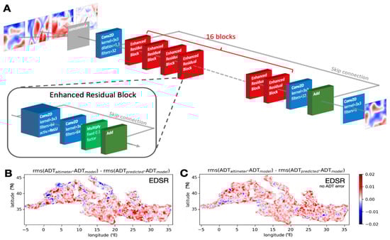 Enhanced Deep Super-Resolution (EDSR) baseline model tested for the reconstruction of high-resolution absolute dynamic topography from multiple channel inputs. (A) EDSR network architecture. EDSR is based on a specific residual block design. (B,C) Relative performance of the EDSR reconstructions, assessed on the independent test data as the difference between the RMSD between the altimeter-like and original model output and the RMSD between the super-resolved ADT and the original model ADT (red indicates smaller RMSD from model predictions). The panels show the performance of the models trained/tested considering: (B) EDSR and the full set of predictor variables; (C) EDSR removing ∆ADT from the predictors. ADT and related RMSD values are expressed in m.