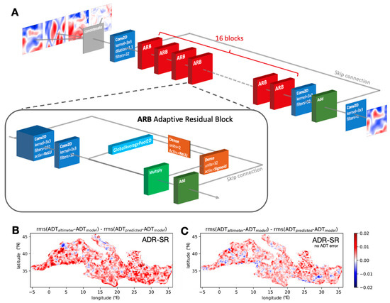 Adaptive Super-Resolution (ADR-SR) baseline model tested for the reconstruction of high-resolution absolute dynamic topography from multiple channel inputs. (A) ADR-SR network. ADR-SR is based on the inclusion of a squeeze-and-excitation module within its residual block design. (B,C) Relative performance of the ADR-SR reconstructions, assessed on the independent test data as the difference between the RMSD between the altimeter-like and original model output and the RMSD between the super-resolved ADT and the original model ADT (red indicates smaller RMSD from model predictions). The panels show the performance of the models trained/tested considering: (B) ADR-SR and the full set of predictor variables; (C) ADR-SR removing ∆ADT from the predictors. ADT and related RMSD values are expressed in m.
