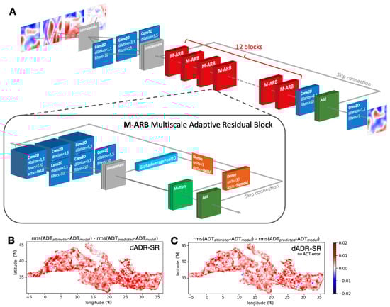 The dilated Adaptive Super-Resolution (dADR-SR) model developed to reconstruct high-resolution absolute dynamic topography from multiple channel inputs. (A) The dADR-SR network architecture; dADR-SR is based on the inclusion of dilated, convolution-based learning inception modules in the core layers of ADR-SR. (B,C) Relative performance of the dADR-SR reconstructions, assessed on the independent test data as the difference between the RMSD between the altimeter-like and original model output and the RMSD between the super-resolved ADT and the original model ADT (red indicates smaller RMSD from model predictions). The panels show the performance of the models trained/tested considering: (B) dADR-DR and the full set of predictor variables; (C) dADR-SR removing ∆ADT from the predictors. ADT and related RMSD values are expressed in m.