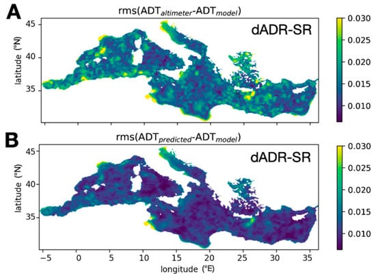 The dADR-SR model performance compared to simulated standard altimetry. (A) RMSD between the altimeter-like and original model output and (B) RMSD between the super-resolved absolute dynamic topography (ADT) obtained with dADR-SR (using full predictors set) and the original model ADT. ADT and related RMSD values are expressed in m.