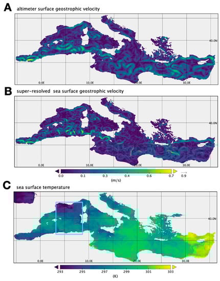 One additional aspect that deserves to be mentioned is that we carried out our tests in the Mediterranean Sea, which is likely one of the most complex areas in terms of upper ocean dynamics (though cloud coverage is less critical than elsewhere) []. This is due to the small Rossby radius of deformation (i.e., the scale at which buoyancy and rotation effects are comparable, which set the characteristic size of dominant flow instabilities) and the occurrence of intense, small-scale air–sea interactions (modulated by highly variable orography) that drive complex coastal dynamics that can significantly affect the source/sink terms in the upper-ocean-temperature-evolution equation. This may undermine our working hypothesis that small scale changes are substantially dominated by advection. It would thus be interesting to train (or even only to test) our model in other areas where intense mesoscale activity is observed (e.g., western boundary currents, Antarctic Circumpolar Current, etc.), eventually starting from different numerical simulations. Additionally, we plan to further improve the network architecture by implementing and testing the latest modules and ideas emerging from computer vision research (e.g., convolutional block attention module (CBAM)), []. Major advances might then come from the design of network architectures that admit the explicit use of sequences of ADT and SST data as predictors, which could then allow users to define physically informed loss functions (e.g., by enforcing some approximate potential vorticity/tracer conservation) to jointly improve the reconstruction of both current and tracer evolution over time.