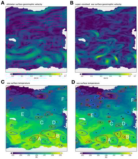 Dynamical structures reconstructed by dADR-SR prediction from real satellite-derived absolute dynamic topography (ADT) and sea surface temperature data (SST) (zoomed from Figure 6). (A) Original altimeter-based surface geostrophic currents; (B) super-resolved surface geostrophic currents; (C,D) satellite SST field with overplot of the eddy contours identified through AMEDA detection algorithm (red = cyclonic, blue = anticyclonic, black dots stand for automatically detected eddy centres) applied to original altimeter currents (C) and to super-resolved field (D). A–F letters serve to more easily locate the dynamical features that are recovered by dADR-SR and missed/misplaced by standard altimetry products (discussed in the text).