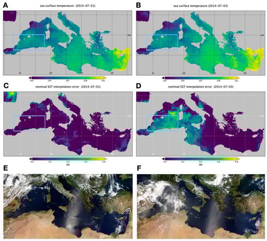 Impact of cloud cover on satellite SST interpolated data. Interpolated field; (A,B), related nominal interpolation error; (C,D), MODIS Terra pseudo-true colour images; (E,F) from NASA Worldview (https://worldview.earthdata.nasa.gov, last accessed on 14 January 2022). On the first date, clear-sky conditions (E) lead to extremely clear and distinct SST patterns and low interpolation errors in all the Mediterranean (A,C). Three days later, clouds arriving from Morocco (F) prevent the reconstruction of small-scale dynamical features in the SST field and lead to increased interpolation errors (B,D). The thin cyan box identifies the area zoomed in Figure 9.