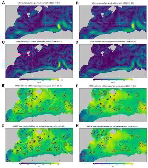 One such example is given in Figure 8, which shows the interpolated SST and the associated nominal interpolation error on the 1st of July 2014 and the same fields taken three days apart. During these three days, clouds gradually moved into the southwestern Mediterranean from Morocco, completely hiding the sea surface to the satellite infrared radiometers on the second date (Figure 8B,E). The corresponding SST field, presenting very clear and distinct structures on the first day, is dramatically blurred by the interpolation in data-void areas (Figure 9). Similar to the example presented in Figure 7, the dADR-SR reconstruction is able to recover much more consistent surface current patterns in the presence of clear-sky thermal observations, e.g., aligning the currents to the true shape/position of the jet found close to 6°E (Figure 9G) along the Algerian coast. This jet is actually feeding a mushroom-like mesoscale structure whose cyclonic eddy is much better retrieved in the super-resolved image and significantly misplaced by the standard product (Figure 9E). Likewise, SR fields also reconstruct the small-scale features observed in the Almeria–Oran front region (i.e., to the north of the SST front found around the Greenwich meridian), which is seen as a unique and quite large cyclone in altimetry maps (consistent with what was noticed by []). Notably, however, the geostrophic current field based on altimetry only suffers minor evolutions after three days (Figure 9F), while dADR-SR actually appears to have smeared out most of the features observed previously. Current intensities are also significantly and unrealistically reduced on the 3rd of July, especially in the intense, anticyclonic meander observed along the Algerian coast at 6°E (Figure 9H).